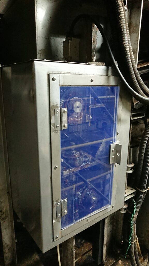 安全対策として、機械の可動部分が見えるようにポリカーボネート製の確認窓を製作・設置し、