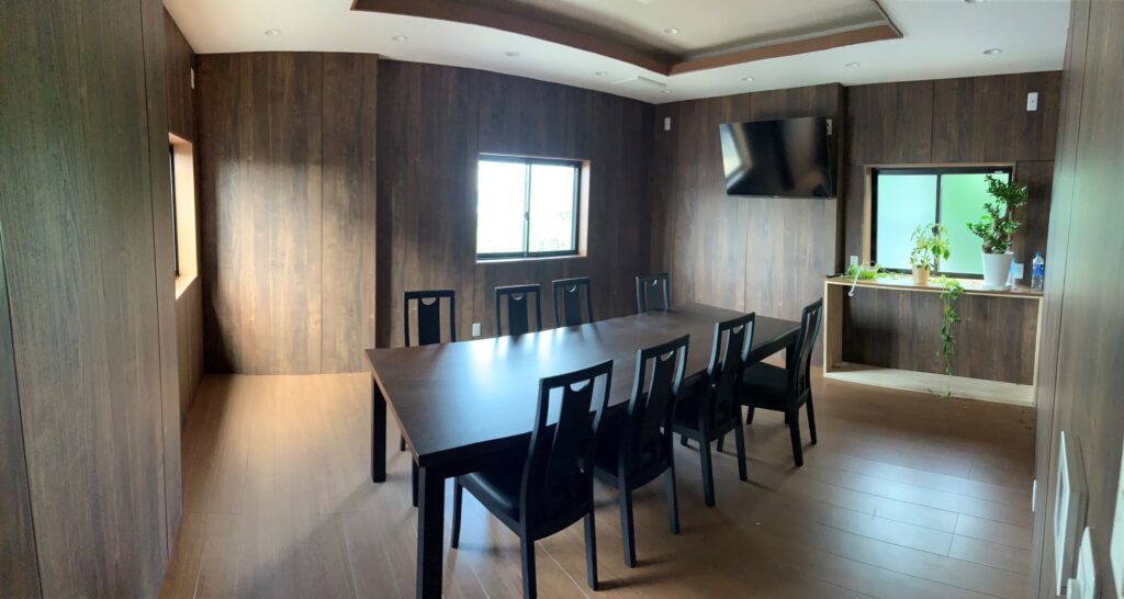 また、今年のはじめから建設を進めておりました、弊社事務所隣の別館会議室ですが、ついに内装工事も完了し、机や椅子も入り、いよいよ「会議室らしさ」が感じられる空間となってきました。